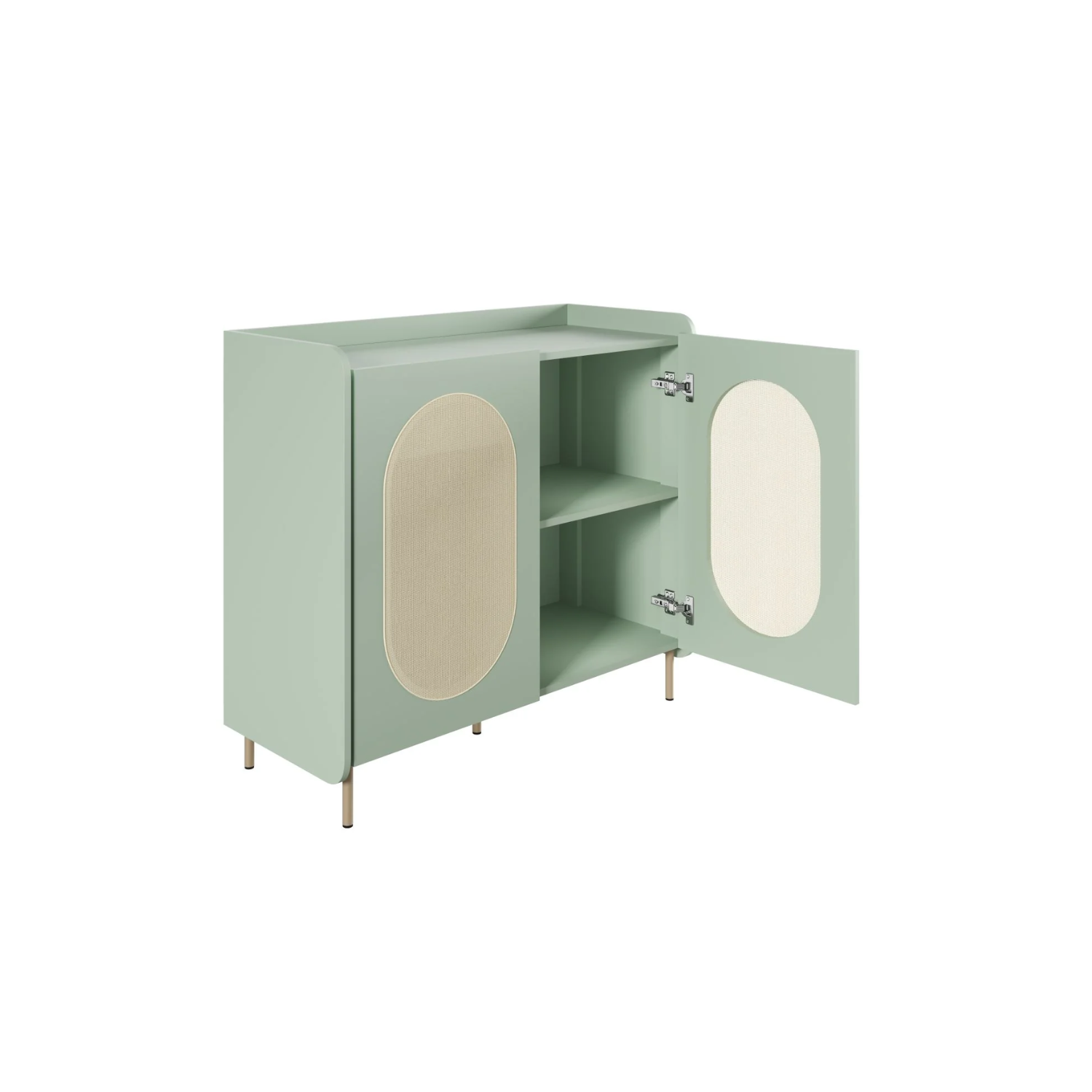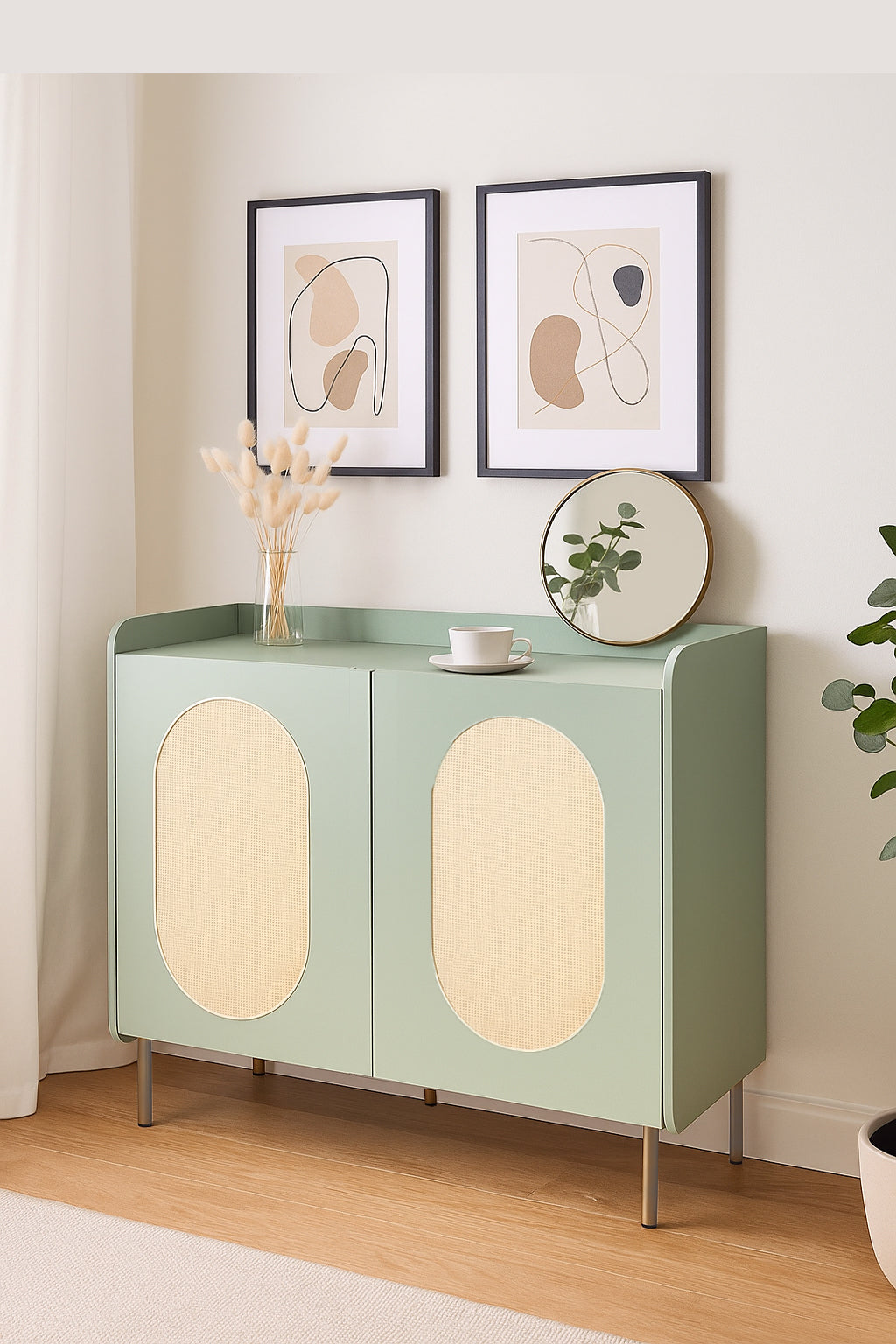 Este buffet presenta un diseño moderno y minimalista en tonos suaves de verde menta. Destacan sus puertas laterales con detalles ovalados en color beige claro, aportando textura y elegancia. Las patas delgadas y metálicas proporcionan un aspecto ligero y contemporáneo, ideal para ambientes sofisticados.