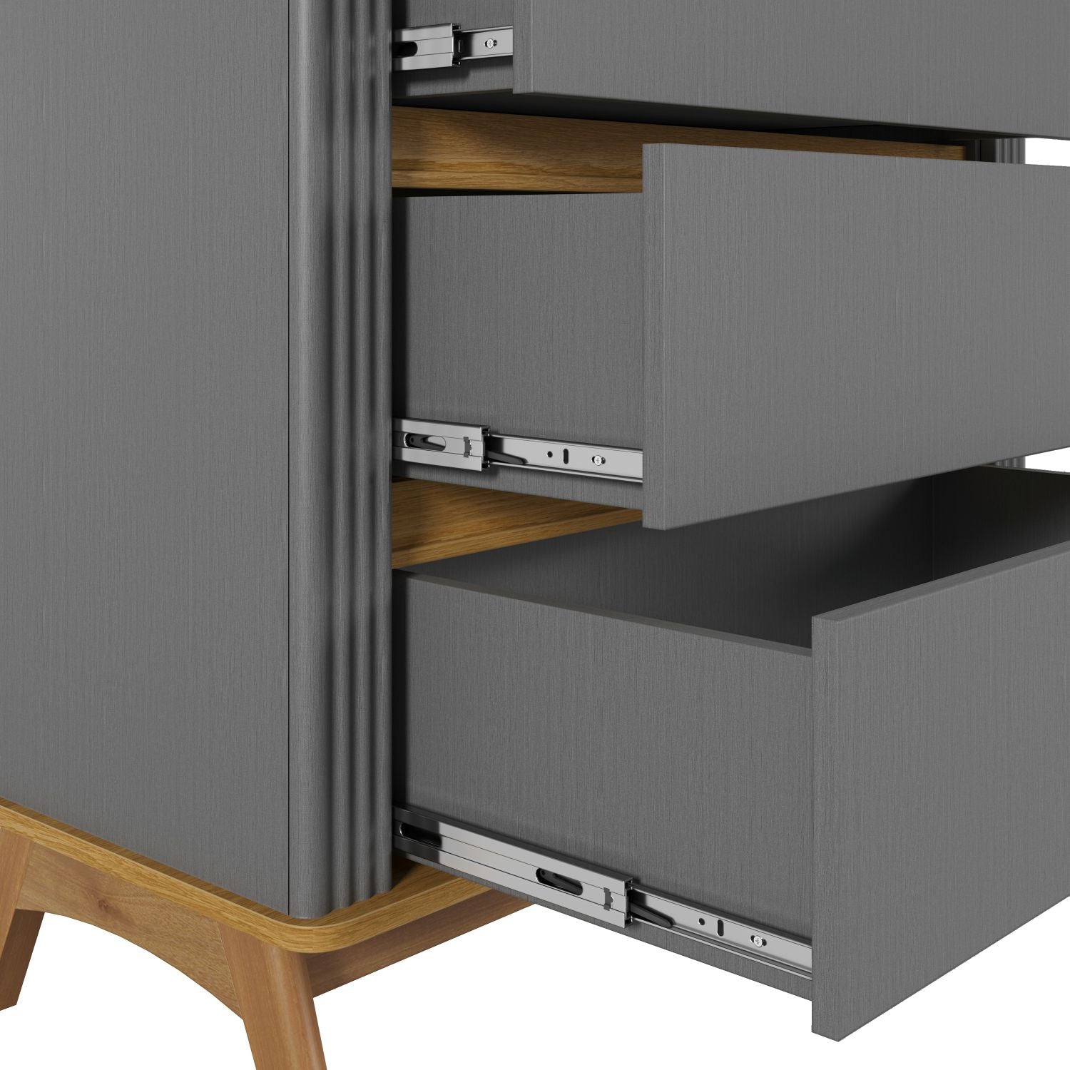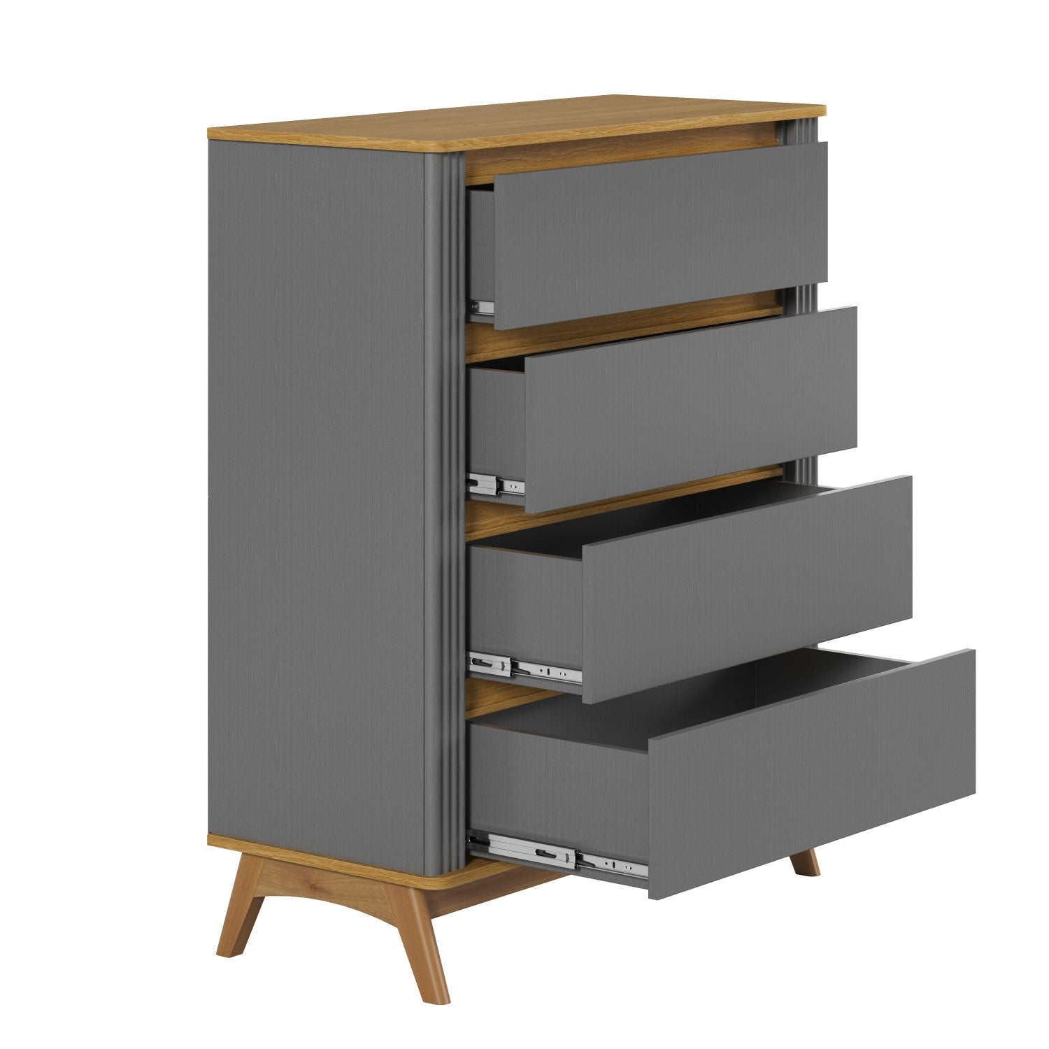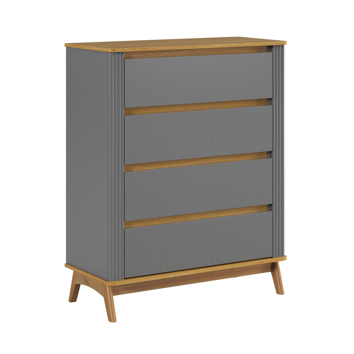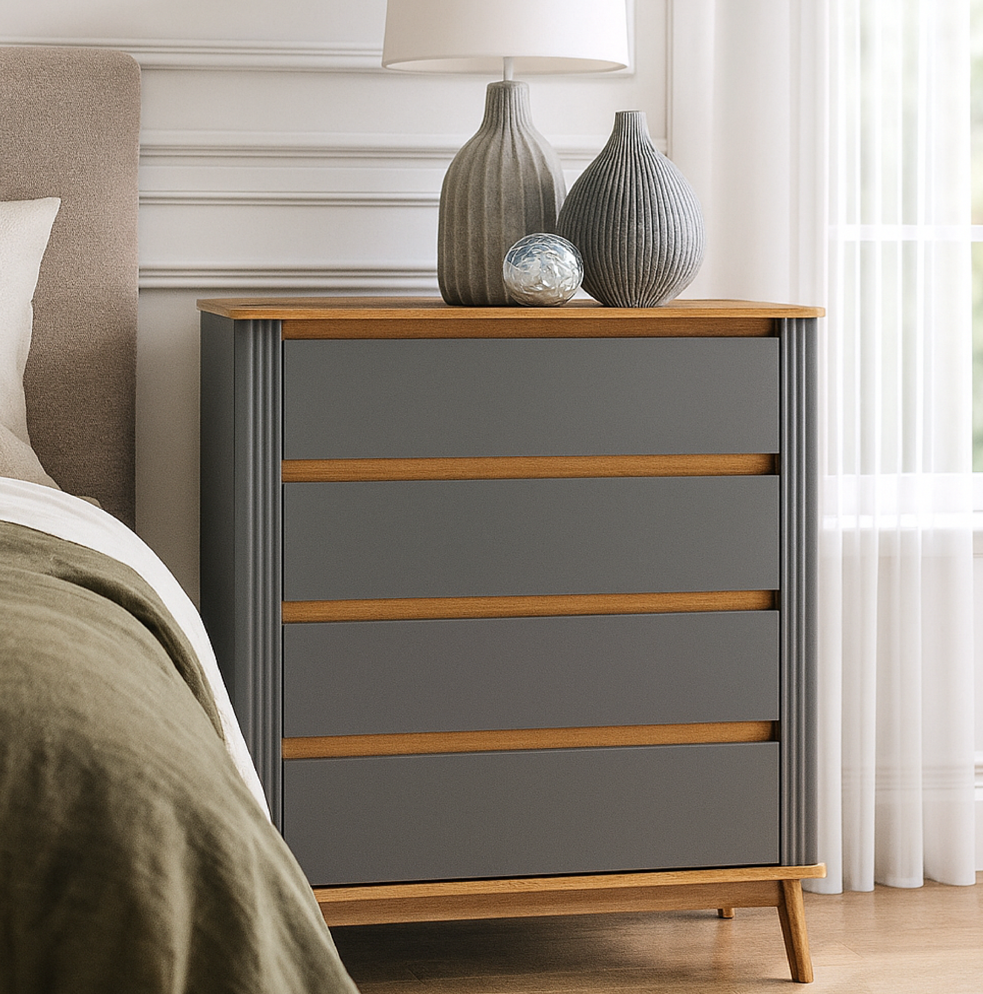 La Cómoda Alba destaca por su diseño moderno de líneas limpias, combinando una estructura  gris con detalles en madera natural que aportan calidez y estilo escandinavo. Sus cuatro amplios cajones ofrecen el espacio perfecto para mantener todo en orden, desde ropa hasta textiles del hogar.