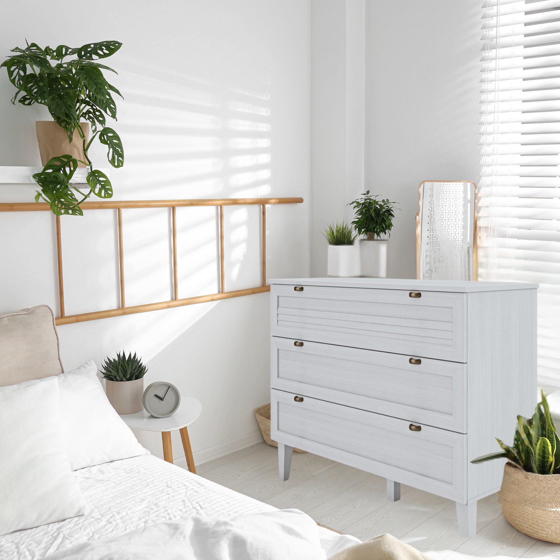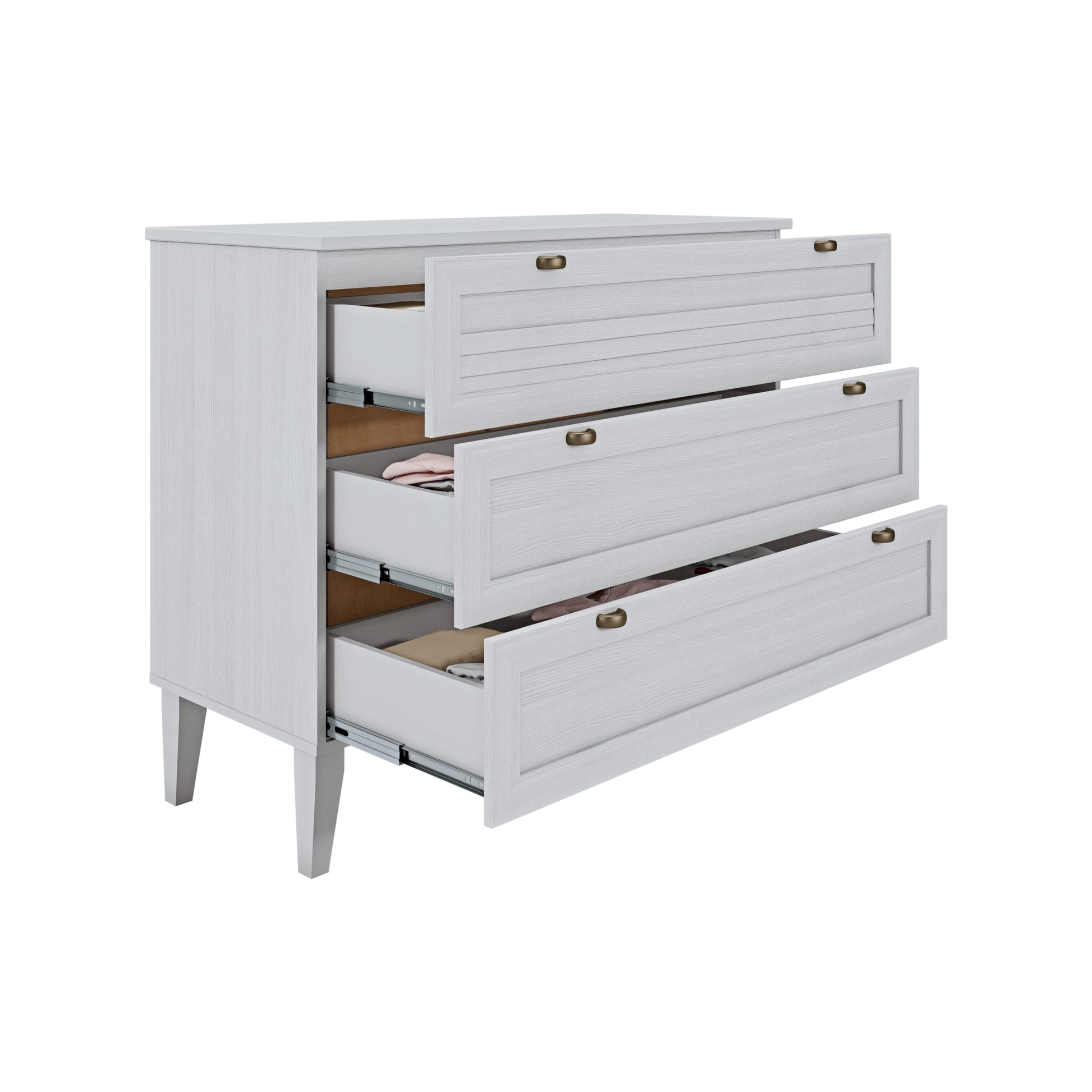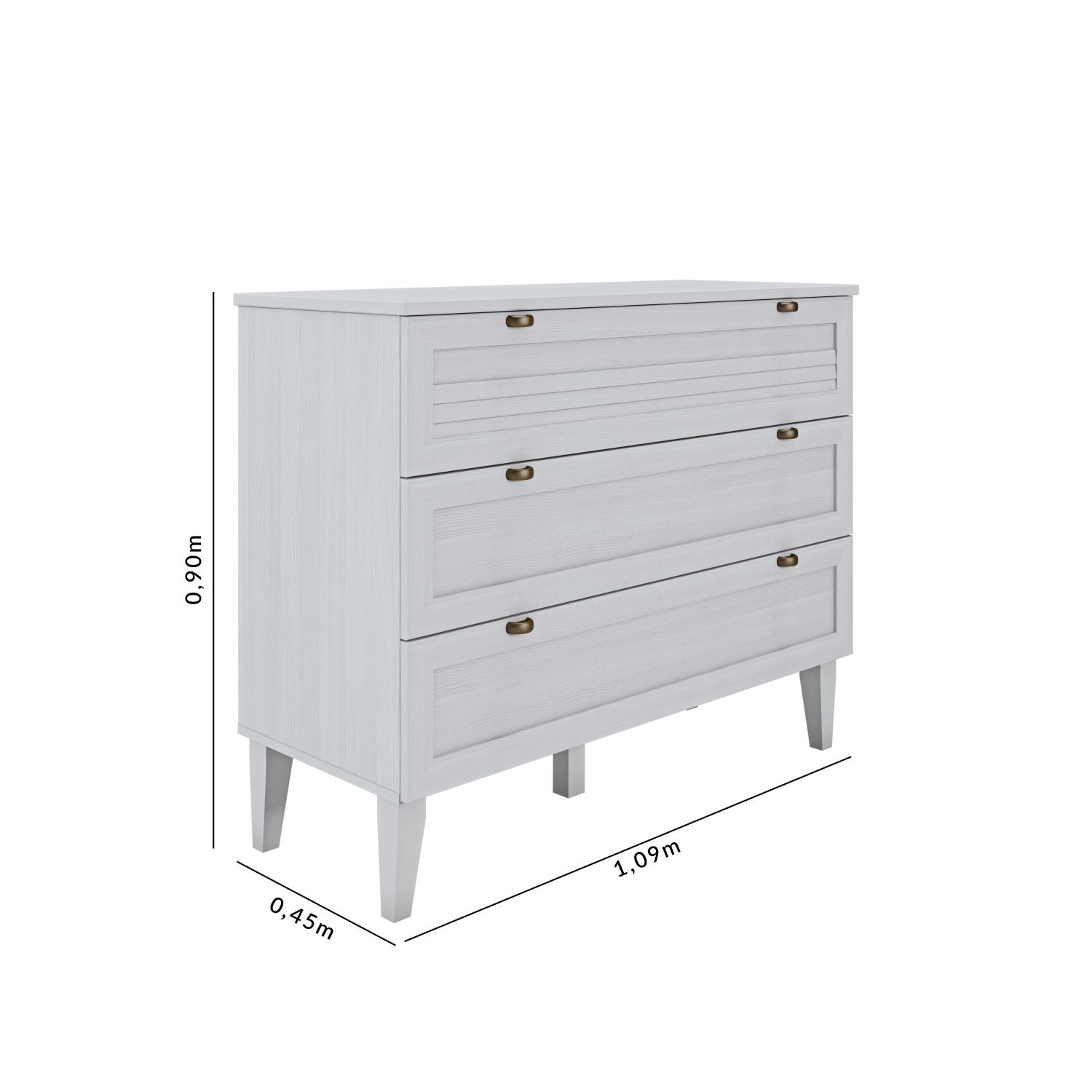 Cómoda, diseñada con 3 amplios cajones para organizar la ropa . Elaborada en madera 100% MDF con patas de madera, corredoras telescópicas y bisagras metálicas con amortiguador. Además cuenta con sistema de anti vuelco. No Incluye accesorios de fotografía.
