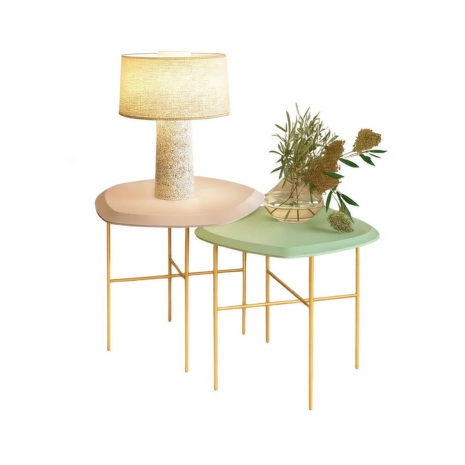 Descubre el encanto de este set de dos mesas auxiliares en formas geométricas irregulares y patas metálicas. La combinación de los acabados blanco mate y verde menta aporta un aire fresco y sofisticado a cualquier rincón de tu hogar.