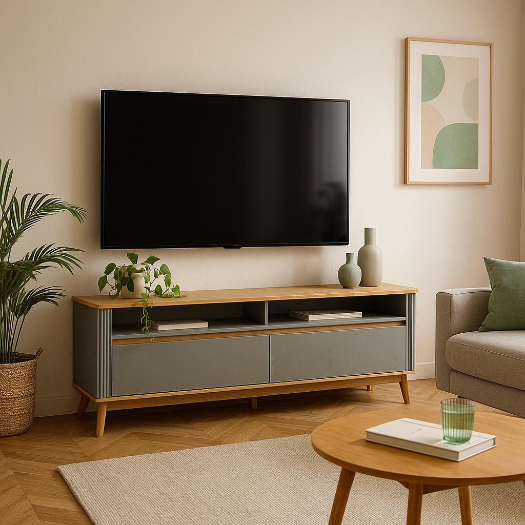Este rack de estilo escandinavo combina funcionalidad y diseño contemporáneo con un toque natural. Cuenta con 2 amplios compartimentos cerrados para mantener el orden y 2 espacios abiertos ideales para equipos electrónicos o decoración. Sus patas inclinadas, refuerzan su estética retro moderna, haciéndolo perfecto para livings, salitas o dormitorios que buscan un equilibrio entre elegancia y practicidad. Ideal para acompañar televisores de gran tamaño o como mueble bajo multifuncional.