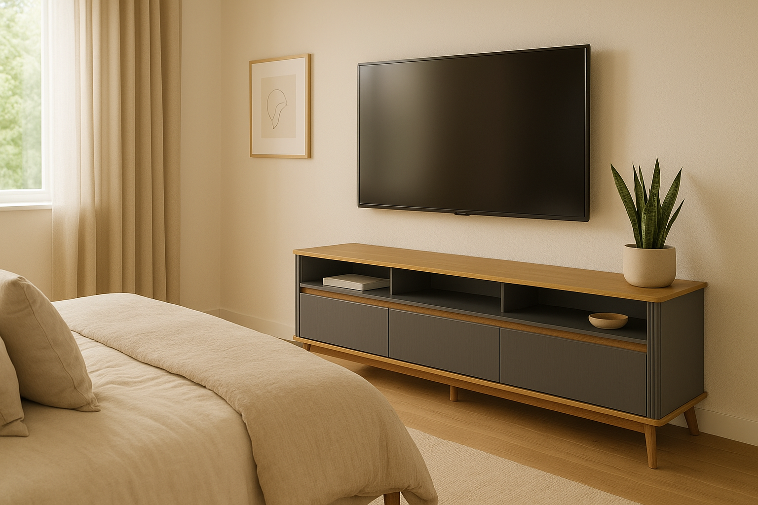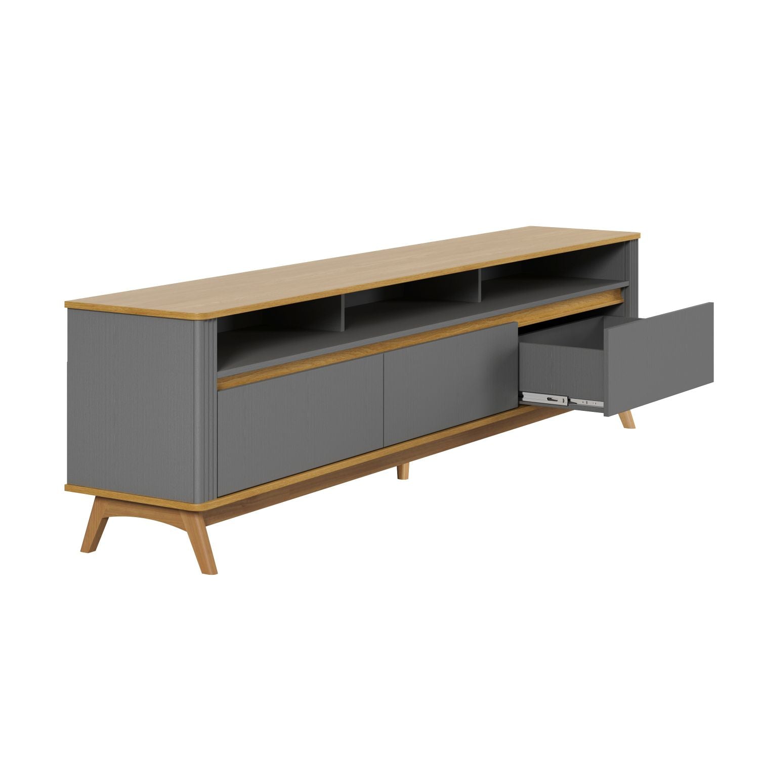Este rack de estilo escandinavo combina funcionalidad y diseño contemporáneo con un toque natural. Cuenta con 3 amplios compartimentos cerrados para mantener el orden y 3 espacios abiertos ideales para equipos electrónicos o decoración. Sus patas inclinadas, refuerzan su estética retro moderna, haciéndolo perfecto para livings, salitas o dormitorios que buscan un equilibrio entre elegancia y practicidad. Ideal para acompañar televisores de gran tamaño o como mueble bajo multifuncional.