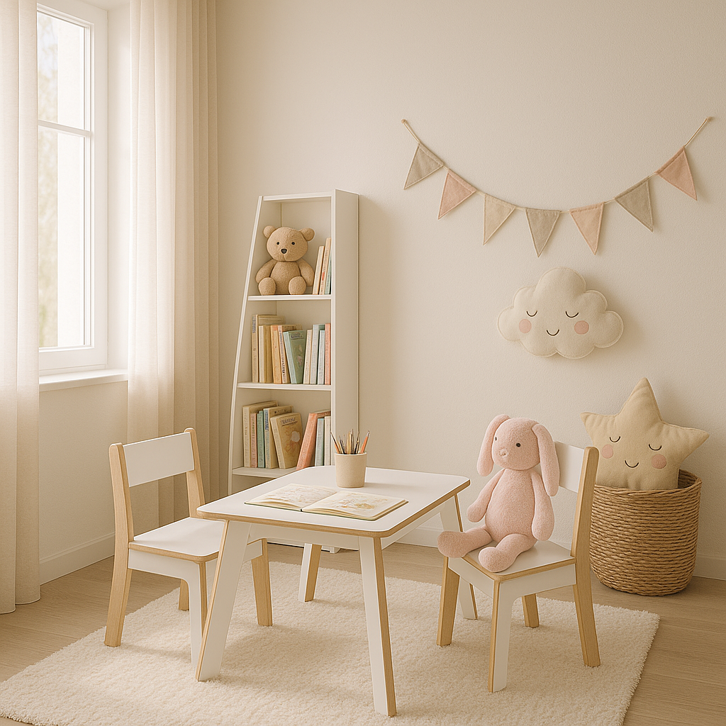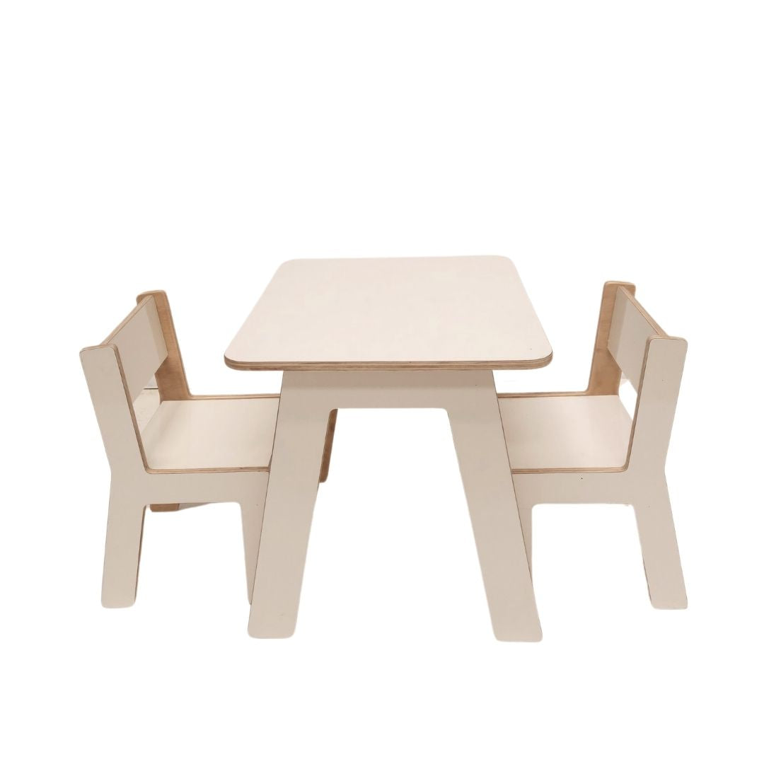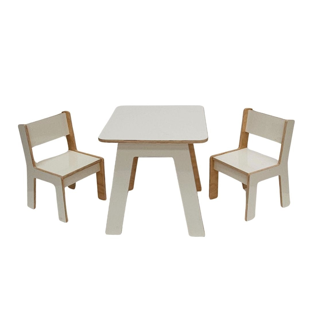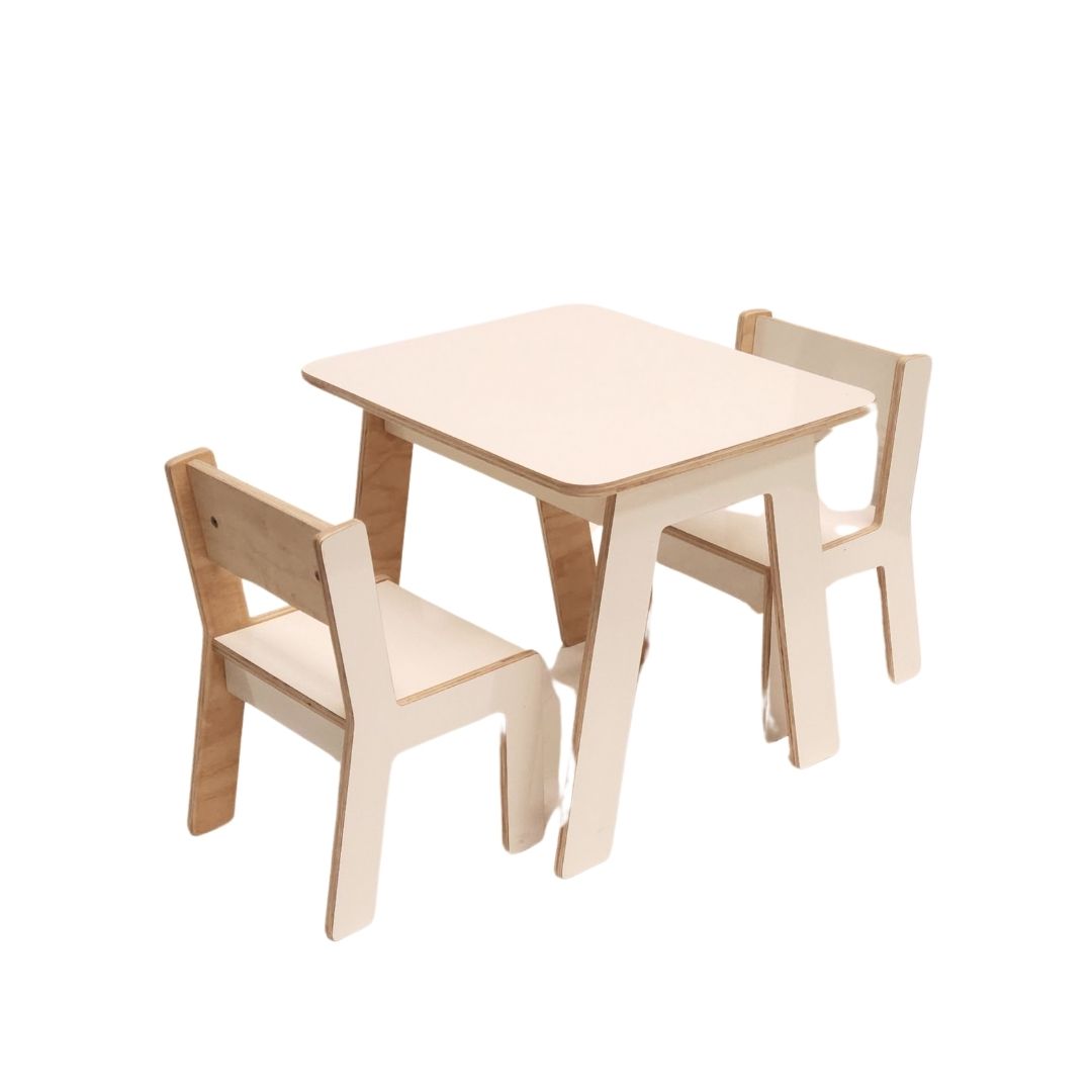 Set Sillas + Mesa RTA ideal para que los niños en etapa Pre Escolar puedan realizar tareas y actividades en casa. Elaborado en madera de terciado e=15mm calidad AnAn, con una cara enchapada en laminado decorativo color blanco (Formalita), la otra barnizada, cantos sin filos, fácil de armar y no requiere herramientas para ello.