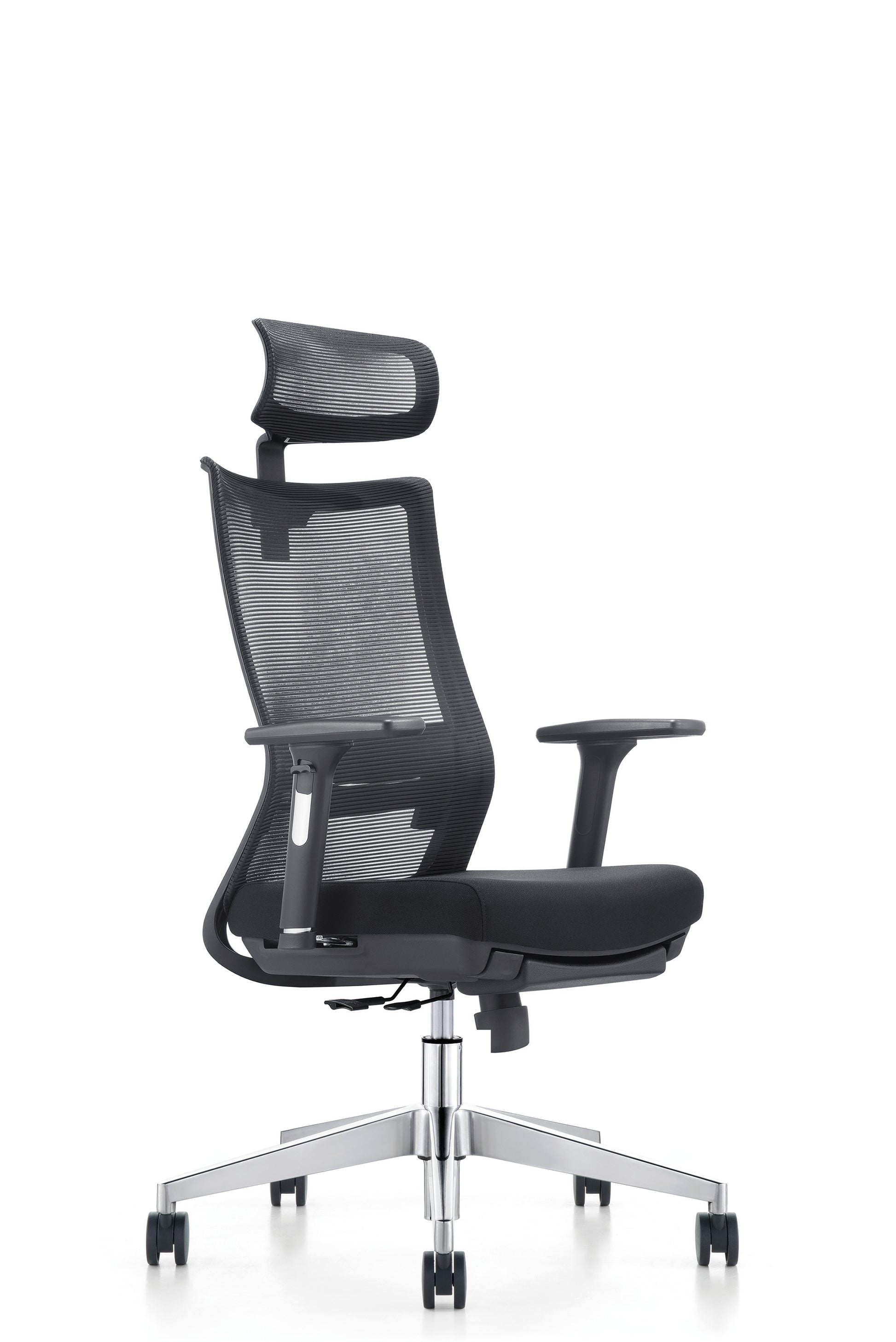 Sillón de respaldo alto, giratorio en 360° y regulable en altura, con cabecero en malla regulable en altura.