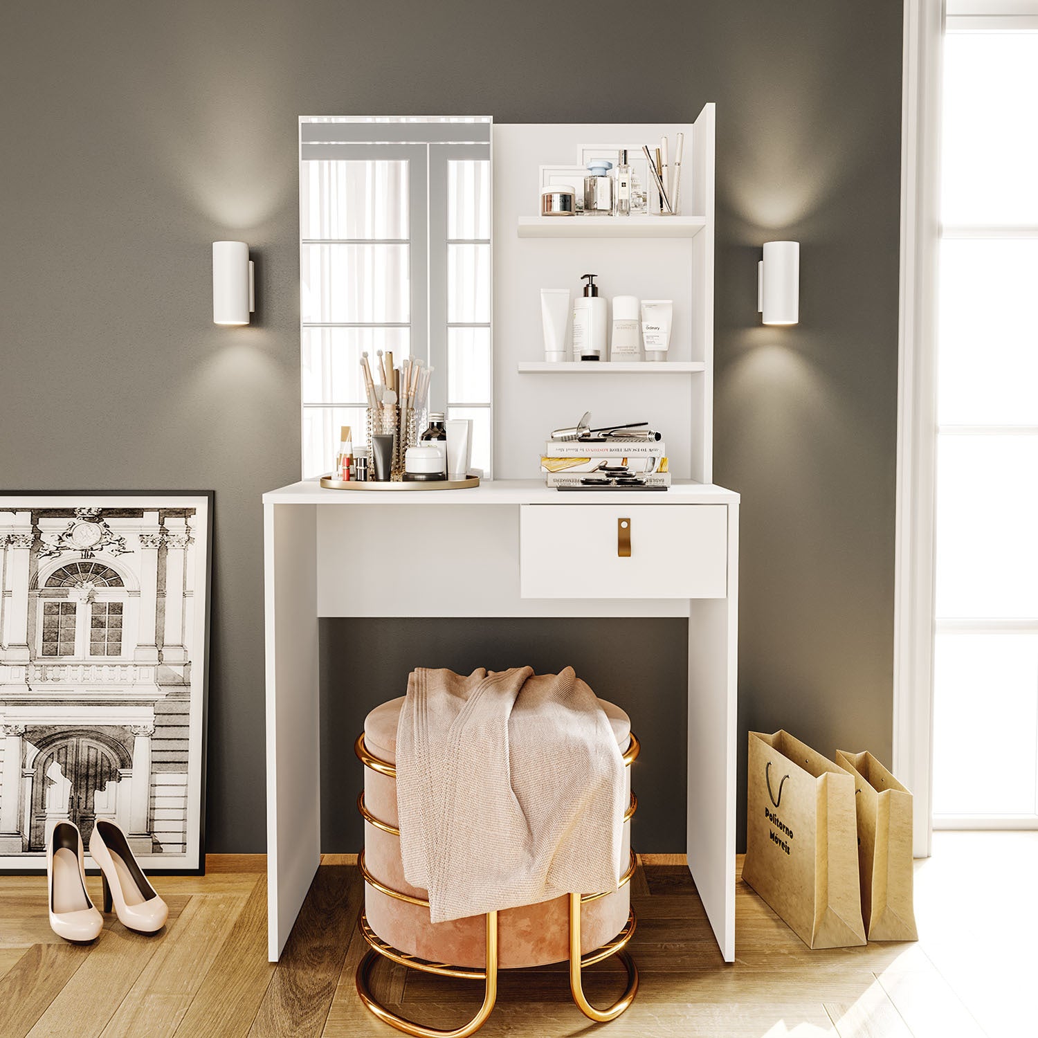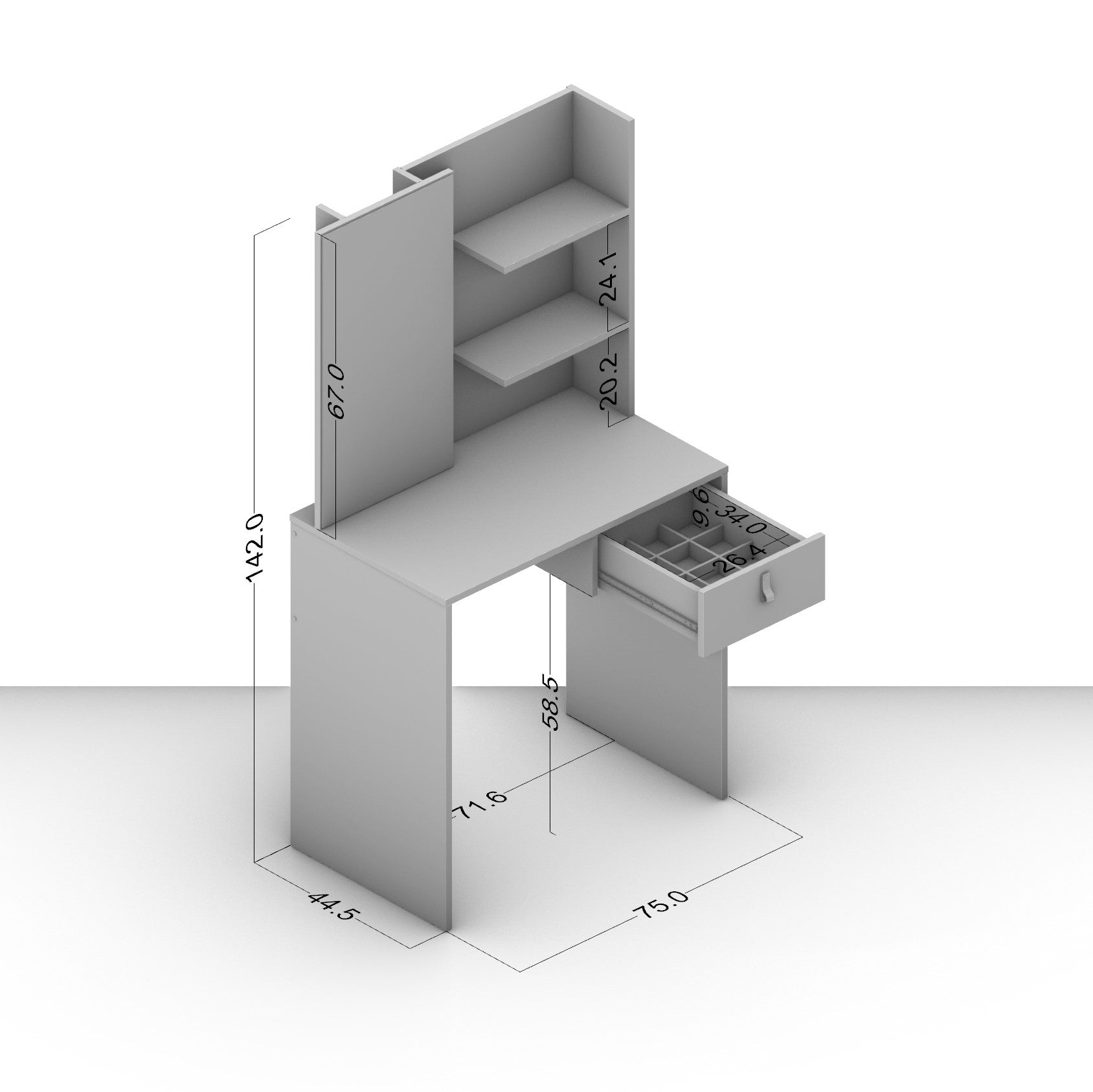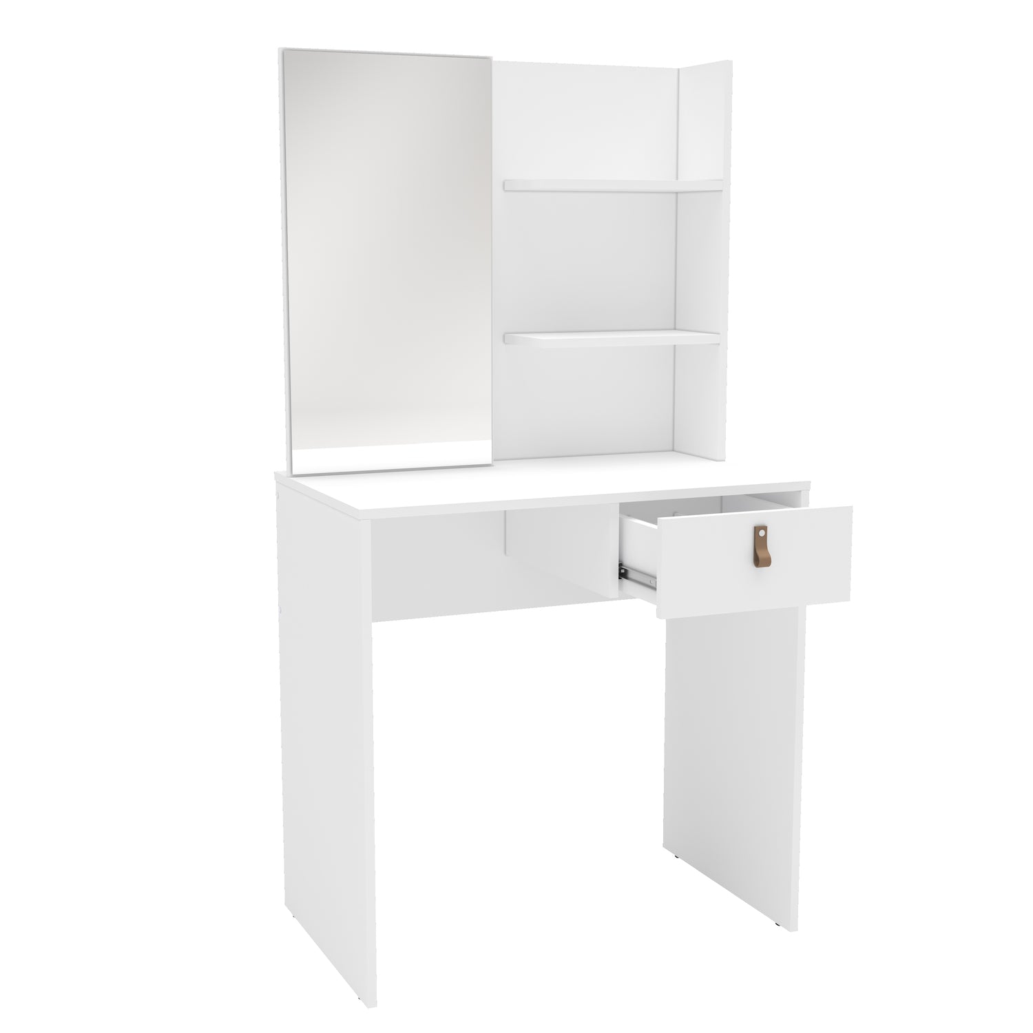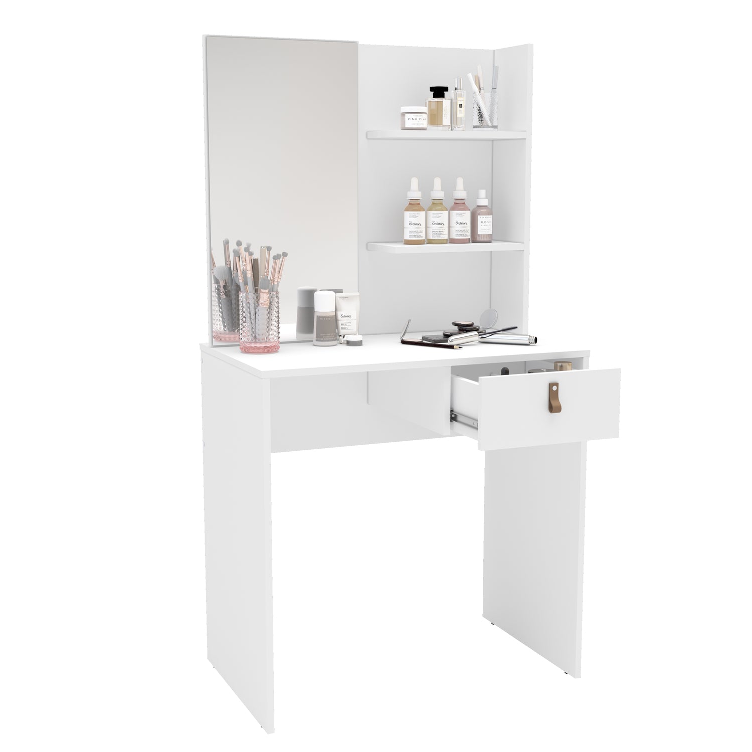 El tocador mallorca es un mueble de estilo nórdico diseñado para organizar tus artículos personales como joyas, maquillaje etc. Su color blanco nos entrega un concepto de orden y limpieza. Cuenta con un espejo, dos repisas y un cajón, match perfecto para el orden de tu espacio personal. Gracias a sus dimensiones lo puedes utilizar en el espacio que más te acomode, es un regalo perfecto para adolescentes.